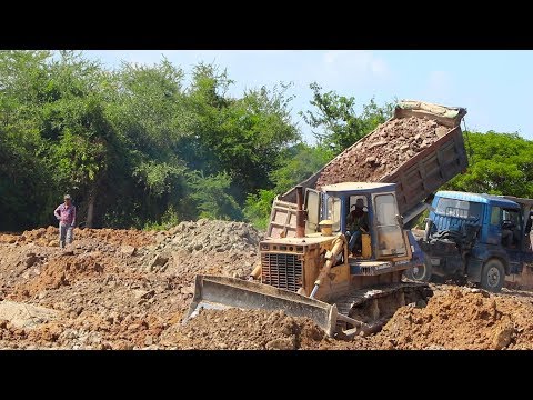Tree Big bulldozer in best operation pushing soil to prepare warehouse c...